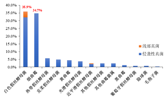 在这项研究中372例肝衰竭并发真菌感染患者中,共发生438例次真菌感染,其中,侵袭性真菌感染289例次(65.98%),浅部真菌感染149例次(34.02%)。在培养分离的真菌菌株中,以白色假丝酵母菌及烟曲霉菌为主,分别占35.92%和34.69%。白色假丝酵母菌是浅部真菌感染主要菌株,而侵袭性真菌感染以烟曲霉菌为主(如图示)。这项调查与10年前我院苏海滨等报道的结果(白色假丝酵母菌:曲霉菌为54.1%:12.5%)比较,虽然占据前两位的真菌菌株仍然一致,但曲霉菌占比显著增加。推测一方面是对侵袭性曲霉菌病的认识和检测手段和水平(如支气管灌洗液微生物镜检和培养,G试验、GM试验临床推广,还有典型影像学特征的掌握)在不断提高有关,另一方面肝衰竭临床救治措施增加,特别是抗生素不断进步和升级,肝衰竭患者生存时间延长,并发深部真菌感染的机会和病例也相应增加。