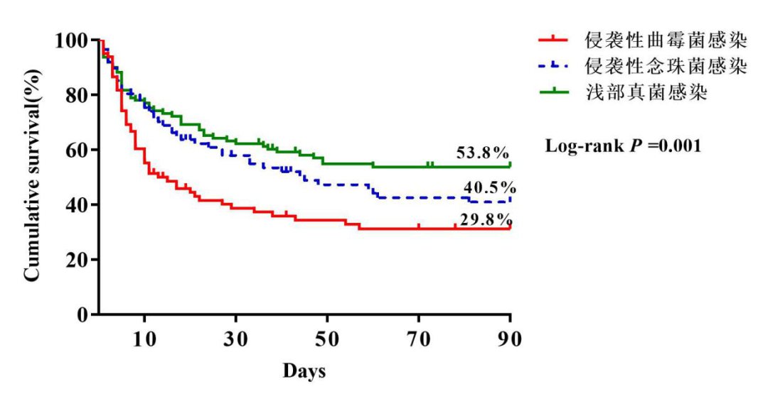 肝衰竭患者一旦发生真菌感染预后极差,由于纳入研究病例不同,文献报道肝衰竭合并真菌感染患者病死率较无感染者增加10%-40%不等。不同真菌菌株对患者的预后影响不同,我们课题组近期研究与早年林芳等报道的结果基本一致,侵袭性曲霉菌对肝衰竭病情影响最显著,预后最差,其次是侵袭性念珠菌感染,浅部真菌感染影响最小(如图)。另有陆晖等报道侵袭性毛霉菌感染对肝衰竭患者病情恶化的影响最大。